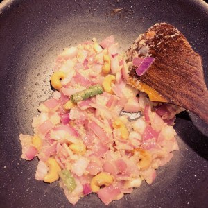 In a pan add oil,then sauté green chili,onion,cashews.