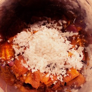 Now add them in blender by adding grated coconut/desicated coconut.