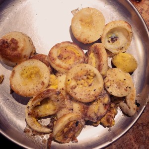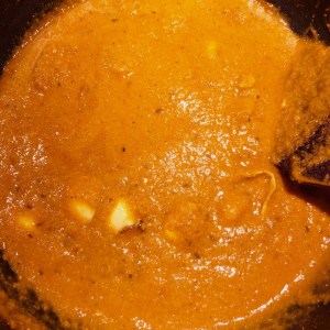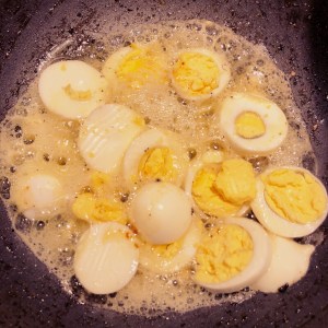 After sautéing the masala for 5 to 7 minutes add the fried eggs to the purée.