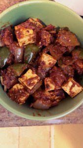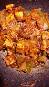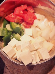 To this add the cubed onion,tomato,capsicum,paneer and mix and marinate for 10minutes.
