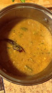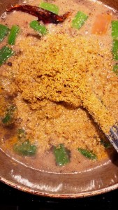 Then add turmeric,salt,asafetida and sambar powder. After 5 minutes add the grounded powder and allow it to boil until the vegies are cooked and then add the mashed thuvar dal to it.
