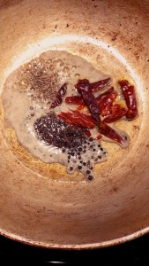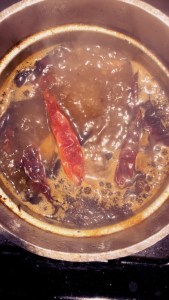 In a separate pan add ghee,red chilies,mustard,cumin and pepper corns and sauté well. And add them to the rasam. Then fry vepampoo in ghee and until it turns to black in color . Add them to the rasam.