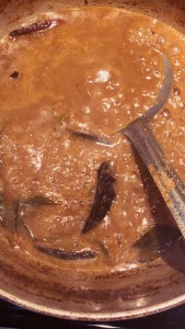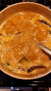 In a pan add the tempering items to the oil and once it splutters add the tamarind water and allow it to boil for 5 minutes by adding turmeric ,asafetida and salt.