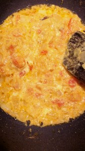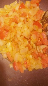 Then add turmeric and salt and then add tomato and sauté well for 2 mins.