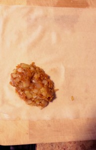 Take the pastry sheet and place the sautéed mixture on the sheet