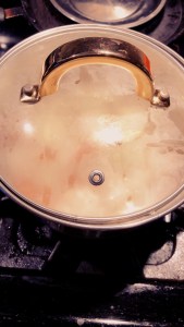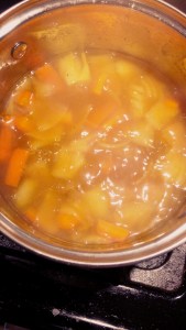 In a vessel add potato and carrot and onions and add water and allow it to boil.