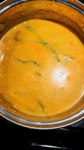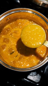 Then let it boil for 5 minutes and add the toor dal to it and then add the rice flour paste a little to it and allow it to thicken and then drizzle a spoon of ghee to it.