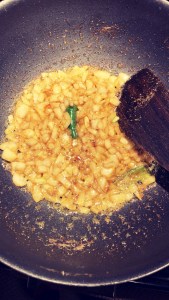 Then in a pan add ghee and add the chopped onions and green chili & ginger and sauté well for two mins.