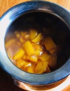 In a vessel add jaggery powder mixed with water then once it starts to heat up add the diced mangoes and then allow it to boil for 5 to 7 mins.