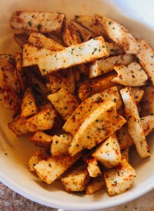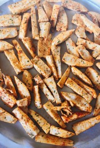 In a bowl add the cut sweet potatoes and on top of it drizzle with oil,chili powder,pepper powder,salt and parsley.. toss them together.