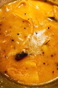 Then add turmeric,salt and sambar powder and allow it to boil for 10 mins. Then add the rice flour paste to it and once the quantity thickens add the fried applam to it. And switch off the flame and drizzle a spoon of gingely oil.
