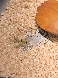 Then in a pan dry fry the rice and add cardamom to it.