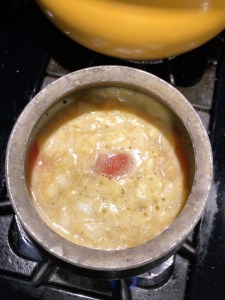 Then in the vessel add tamarind water,tomato,chopped onion,turmeric,asafetida,salt and allow it to boil for two mins.