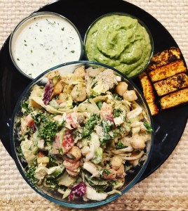 Toss in all the vegies diced and shredded and add in chick pea to it.. add the spices mentioned above and the dressing and toss everything together.