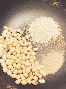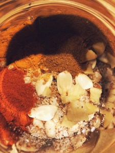 Then add them in the blender and to it add the garlic,ginger,turmeric,red chili,garam masala,fenugreek and grind them into a smooth paste.