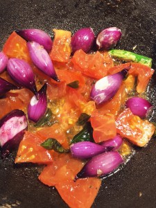 Then in a pan add oil and add mustard,fenugreek,green chili,curry leaves,onions and tomato.