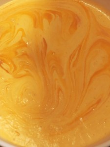 Add them in a glass bowl and then drizzle little purée to make a swirl design..