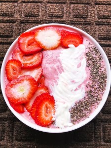 Toss in everything in blender and transfer the purée in a bowl.. garnish with some chia,sliced strawberries.. then a little of coconut cream..