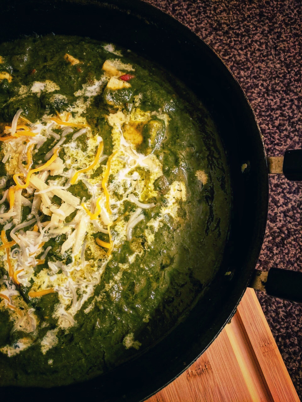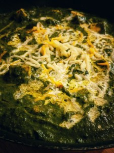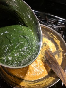 7. Now add the palak purée and then cover with lid again. Cook for 5 mins.