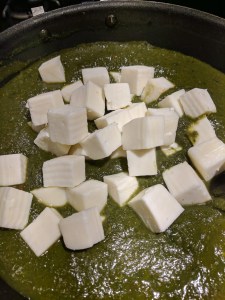 9. Then add the chat masala and diced paneer and cook for two mins.