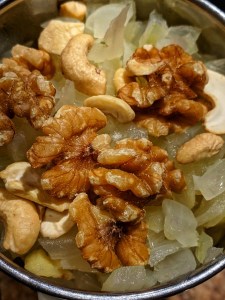 2. In a pan add onions and ginger and boil for 2 mins and then allow it to cool and grind them adding cashews and walnuts. (You can skip cashews or you can just add almonds alone instead of walnuts)