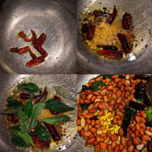 2. Then in the same pan add 2 tbsp of gingely oil and 1 tbsp of sunflower oil and add red chilies.. then Chana dal and urud dal. Now the curry leaves. And then once the dal turned red in color add the peanuts and fry them.