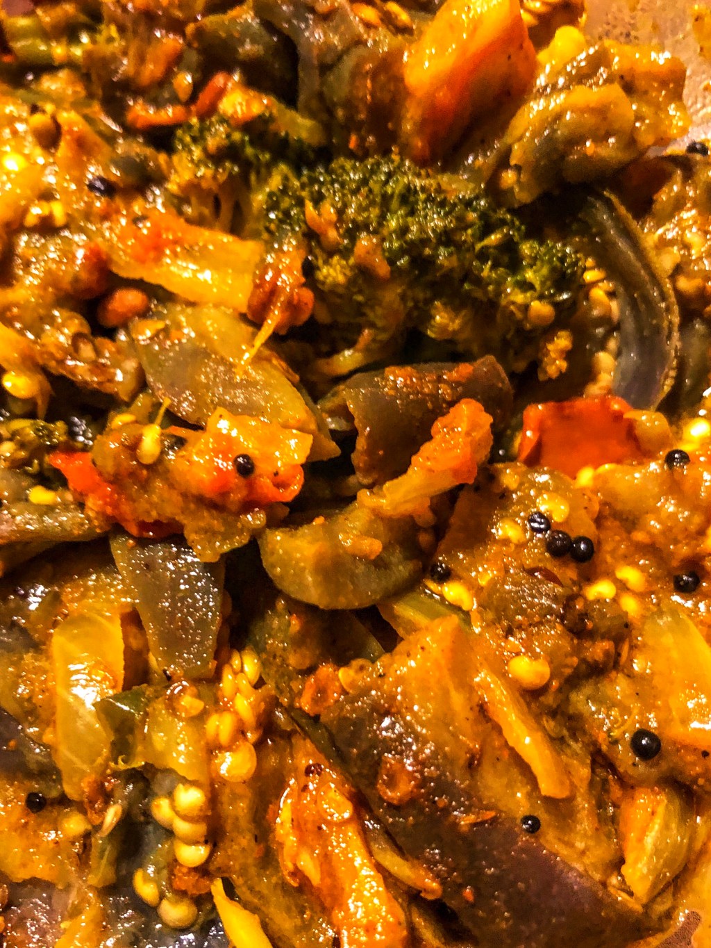 A regular Brinjal vegetable tossed with some broccoli for a unique taste.