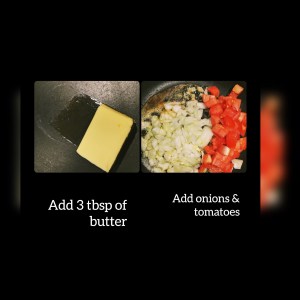 - In a pan add 2 tbsp of butter and to it add the onions & tomatoes and sauté for two mins.
