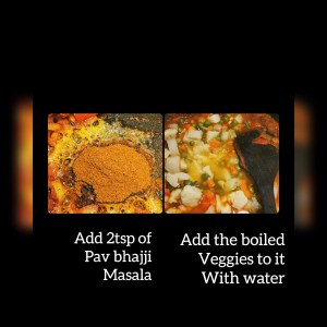 - Add 1/4 tsp of butter in the middle of the gravy mixture and to it add the pav bhajji masala powder.