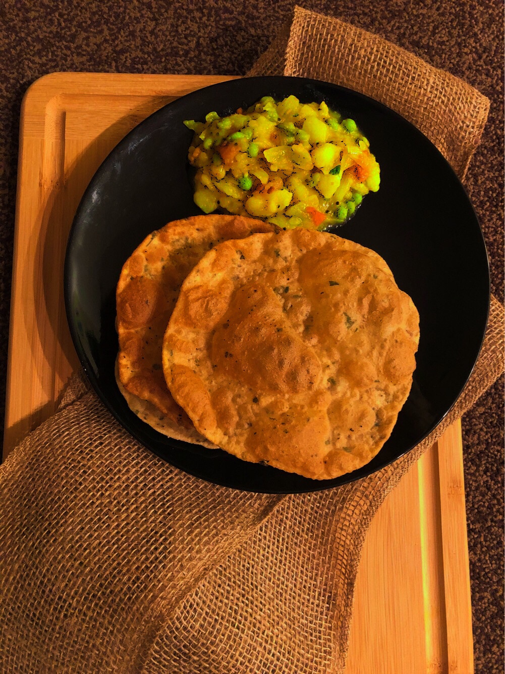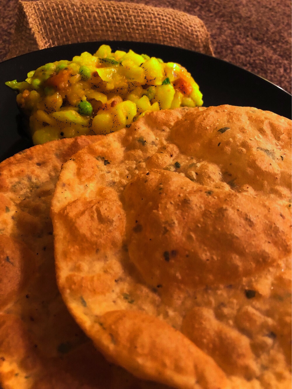 Poori is made out of wheat flour and its fried in oil..