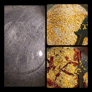• Add oil in a pan, add the red chilies and pepper. Sauté and then to it add the dal items and coriander seeds.