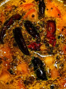2. Sauté them well. And on the other hand in a vessel add 2 cups of tamarind water,1 chopped tomato and to it add salt needed and 1/2 tsp asafetida and 1/2 tsp turmeric powder.