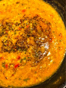 4. Add finely chopped dill leaves and then to it add chaat masala powder and let it cook for 2 more mins. Grate fresh ginger on the dal.. (I love the flavor of freshly grated ginger) Then temper with items below the tempering column.