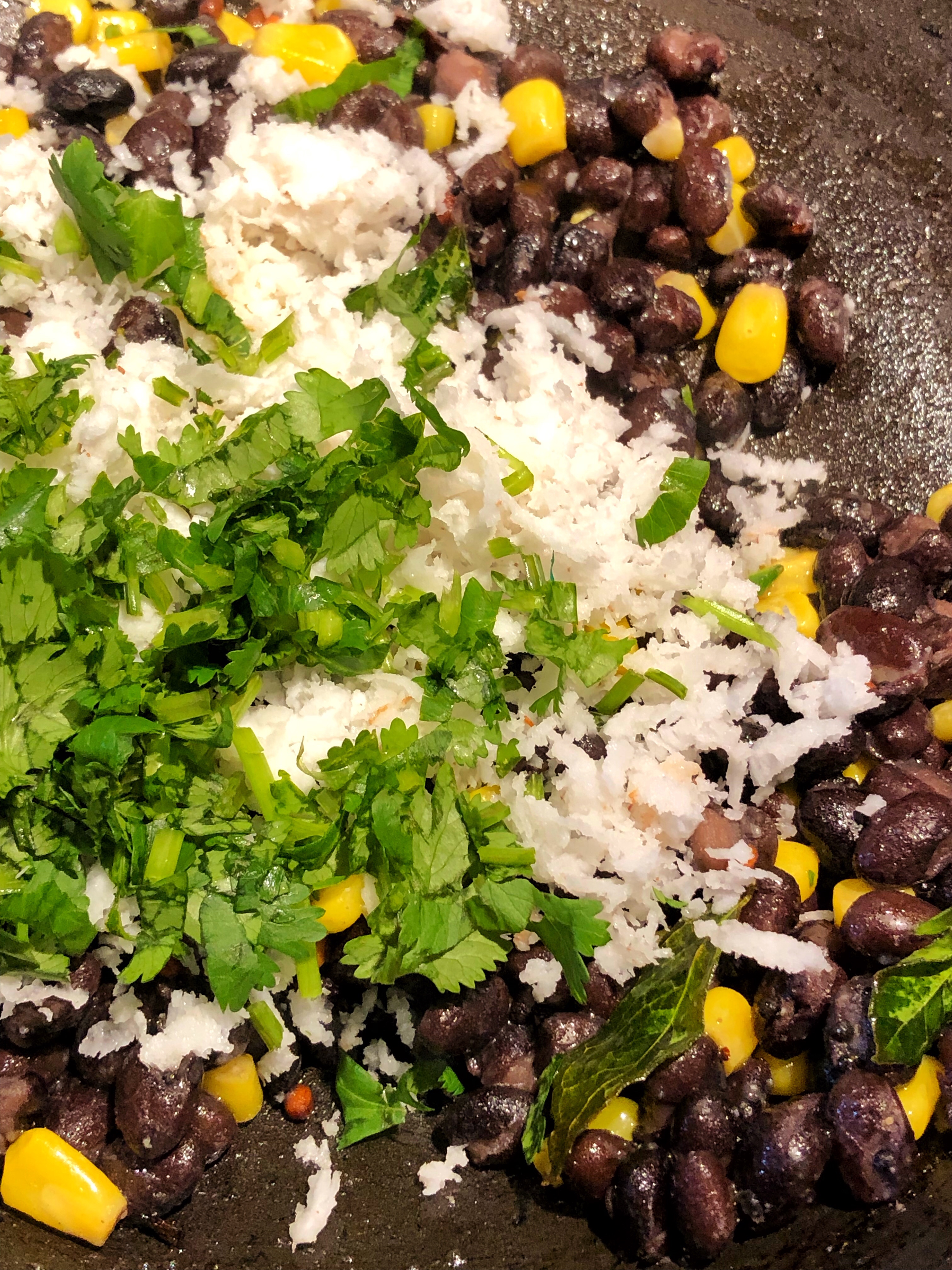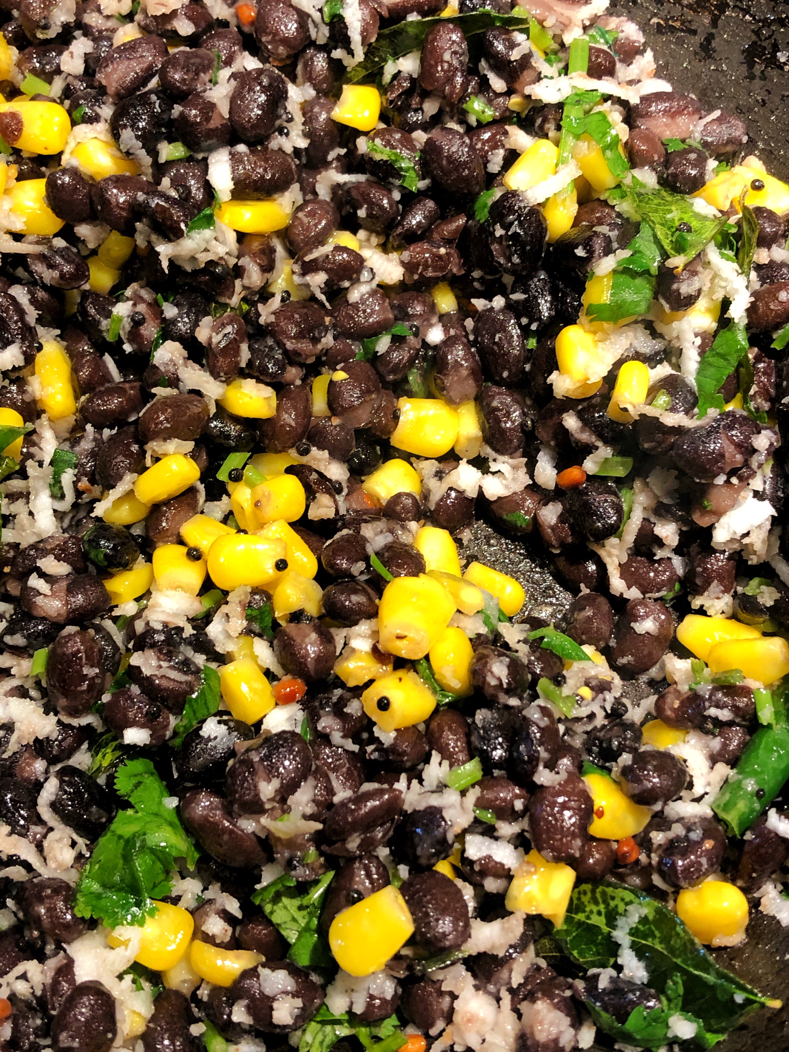 3. Add the black bean and sweet corn and toss together by adding salt and 3/4th tsp of asafetida powder.