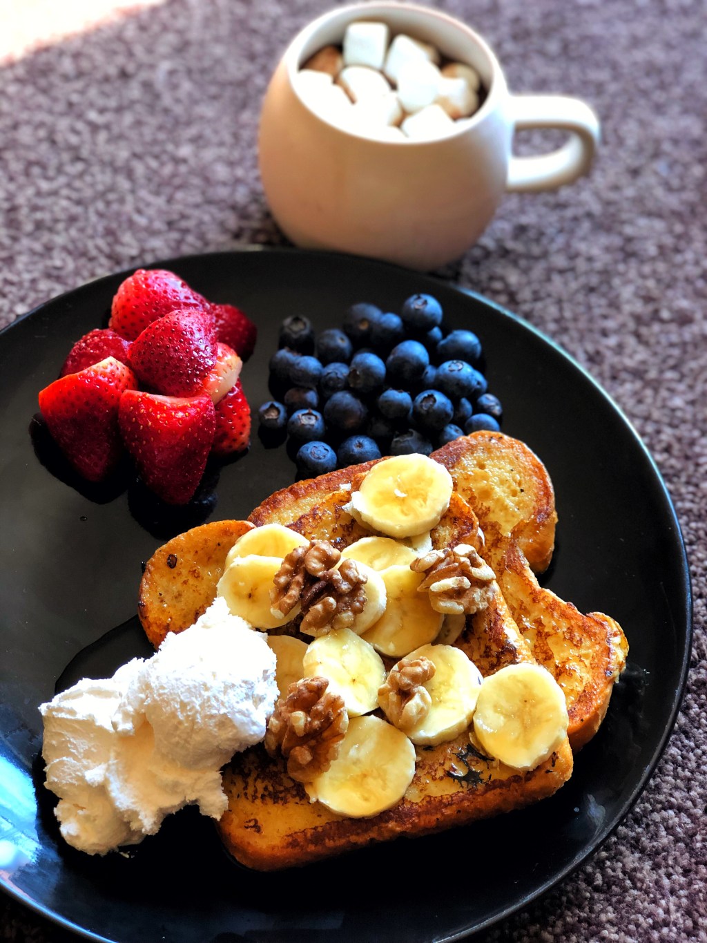 Beat an egg adding 2tbsp of brown sugar, 1tsp vanilla essence, 1/4 cup of heavy cream, 1/4tsp of cinnamon powder. And then dip slices of bread and toast it on the pan and serve hot with bananas , walnuts and maple syrup.! .