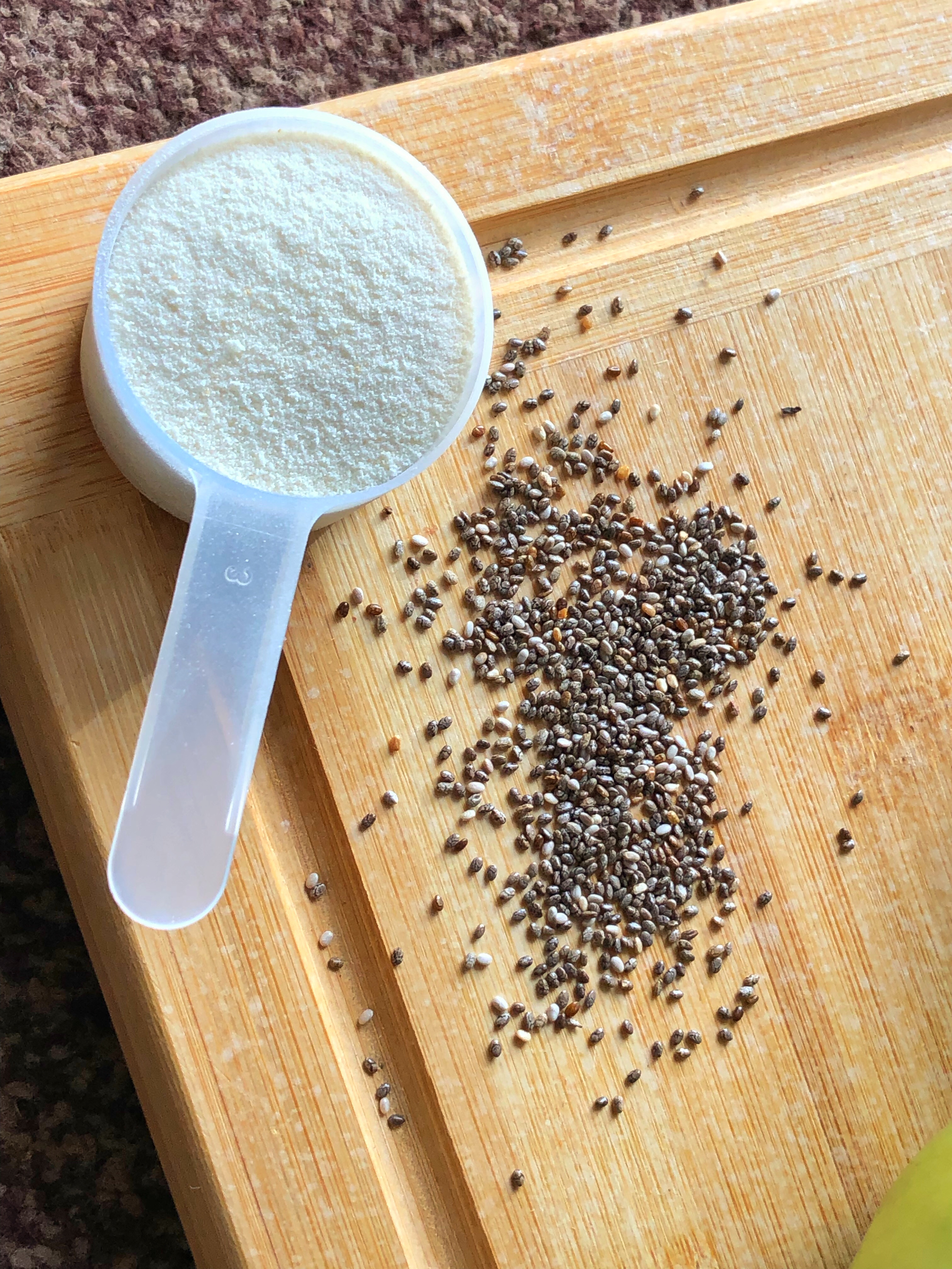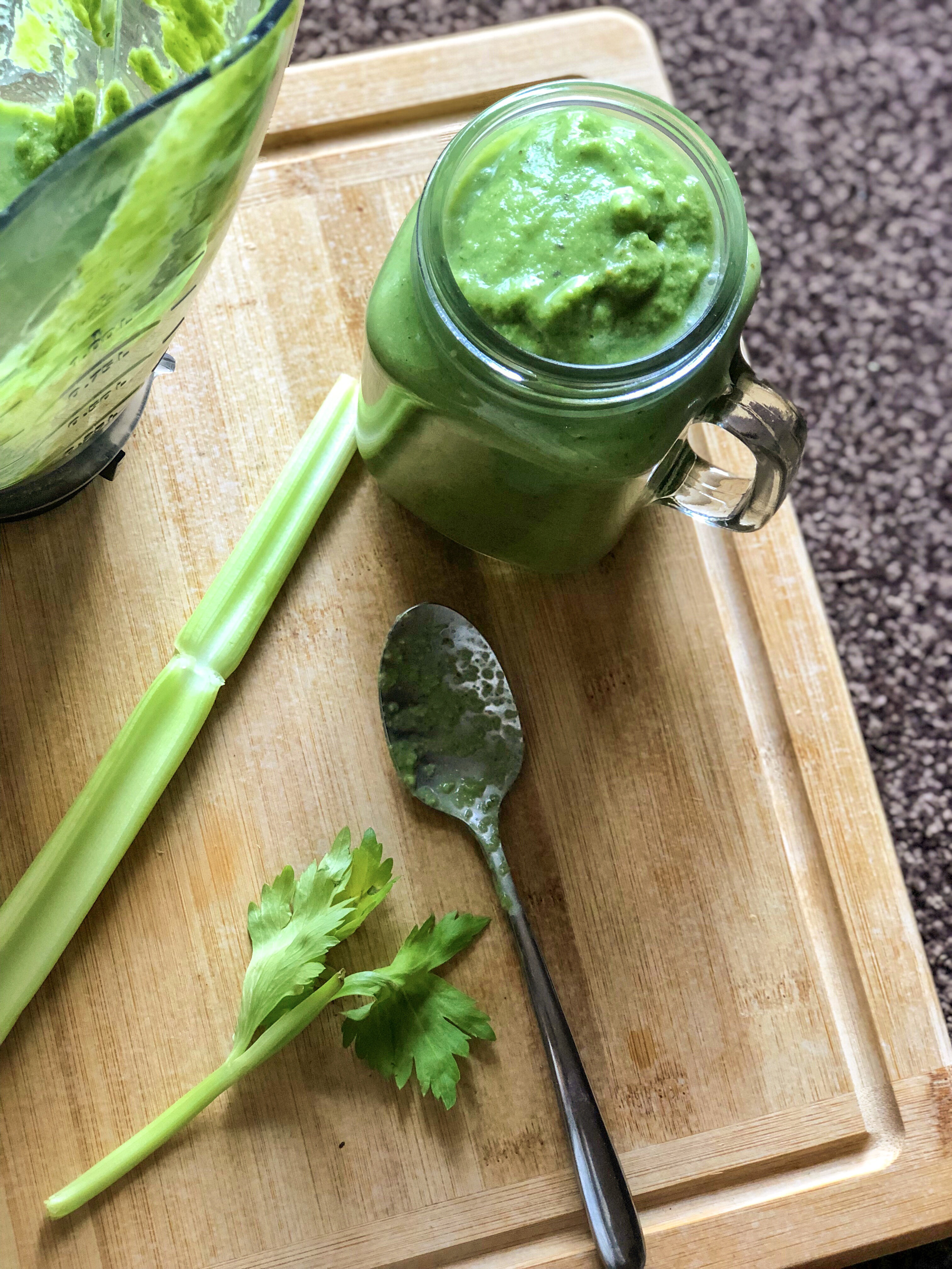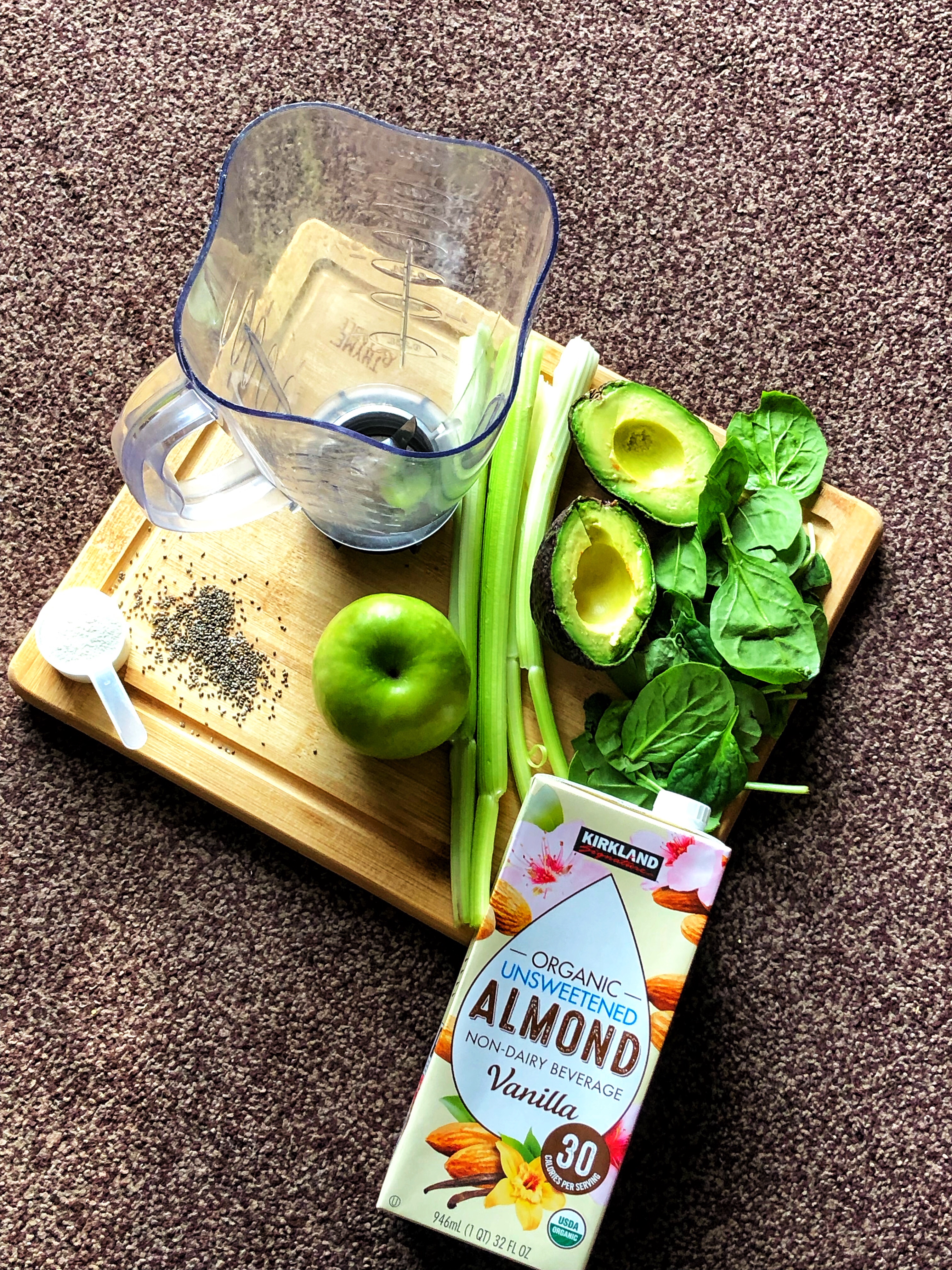 1 Green apple, 1 avocado, handful of spinach/kale, 3 to 4 sticks of celery, 1 tsp of chia seeds, 1 scoop of collagen powder , for sweetener I used 2 tsp of maple syrup (can replace with honey/agave)