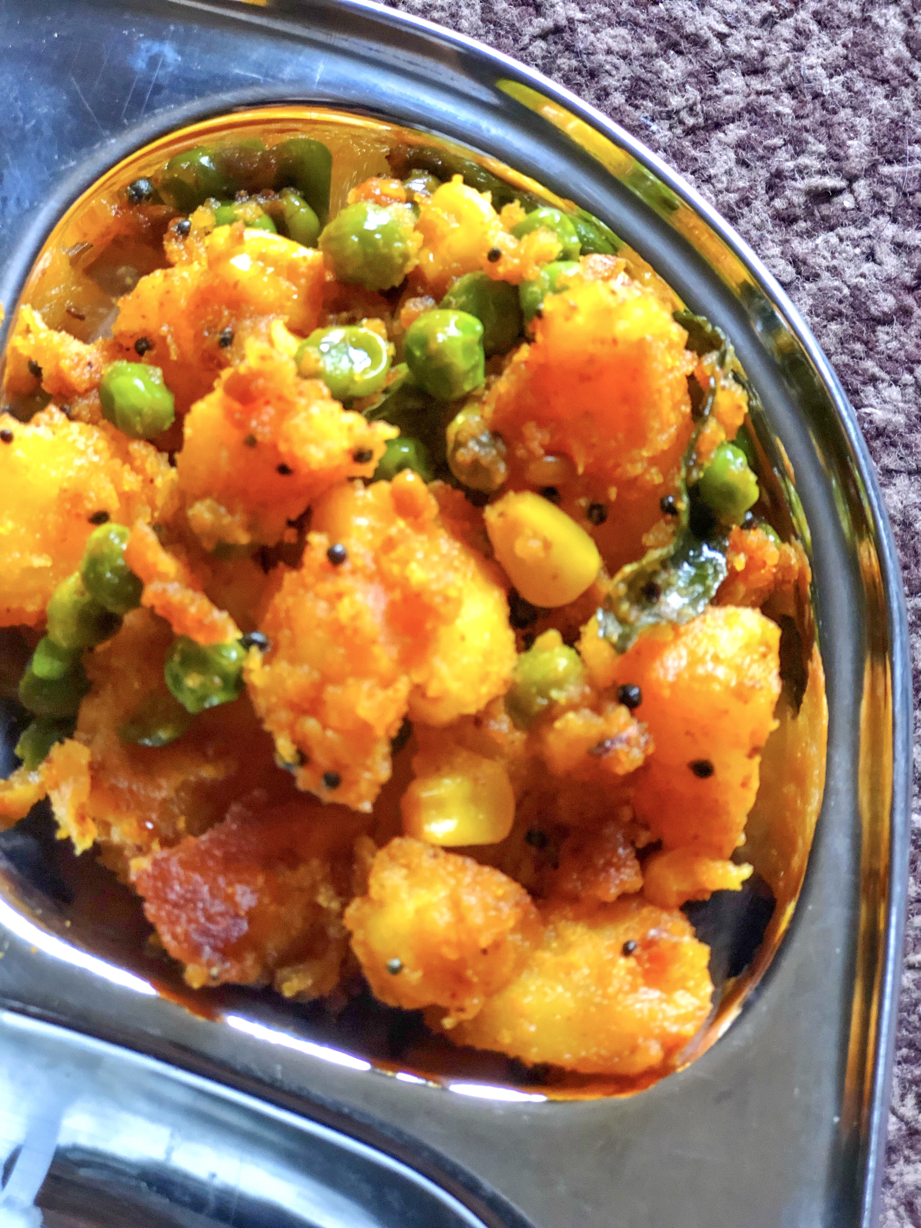 Add 1/2 cup of green peas and 1/4 cup of sweet corn and sauté them.