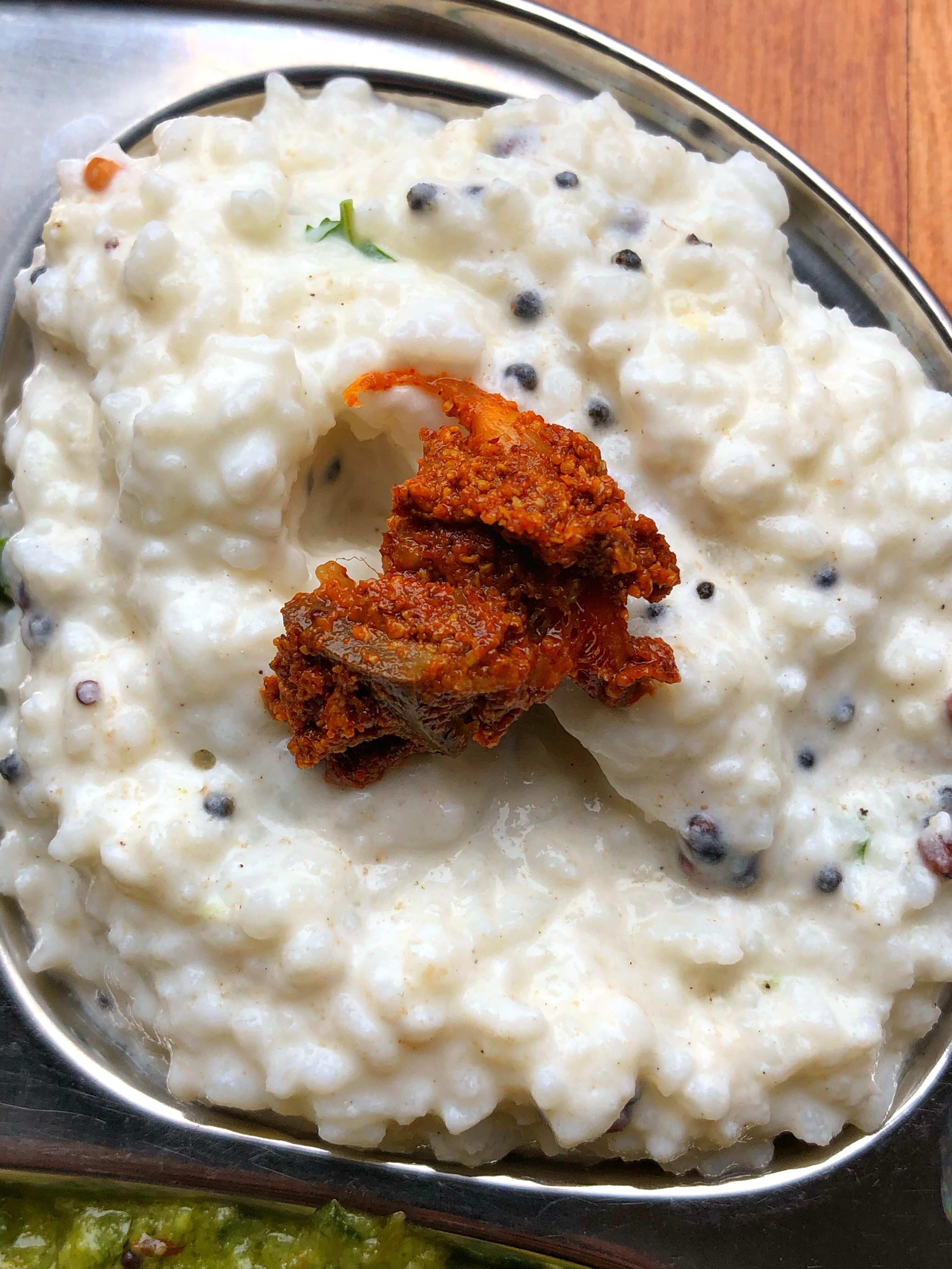 5. Thayir sadham avakai oorugai (curd rice with mango pickle)