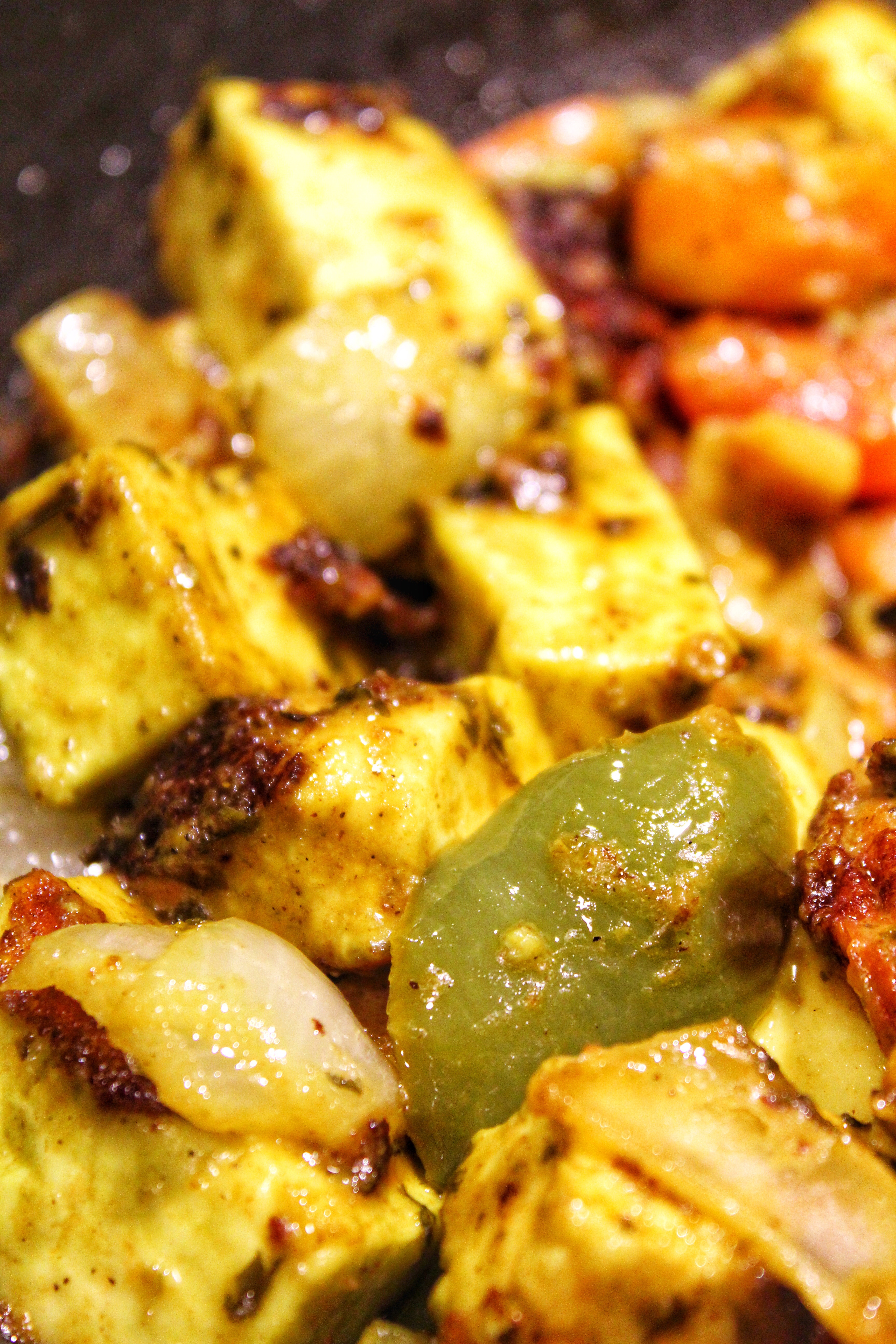 1. Dice 1 onion (big) , 2 medium sized tomatoes, 1/2 green bell pepper,1 cup of Paneer (cottage cheese) and add them to a vessel.