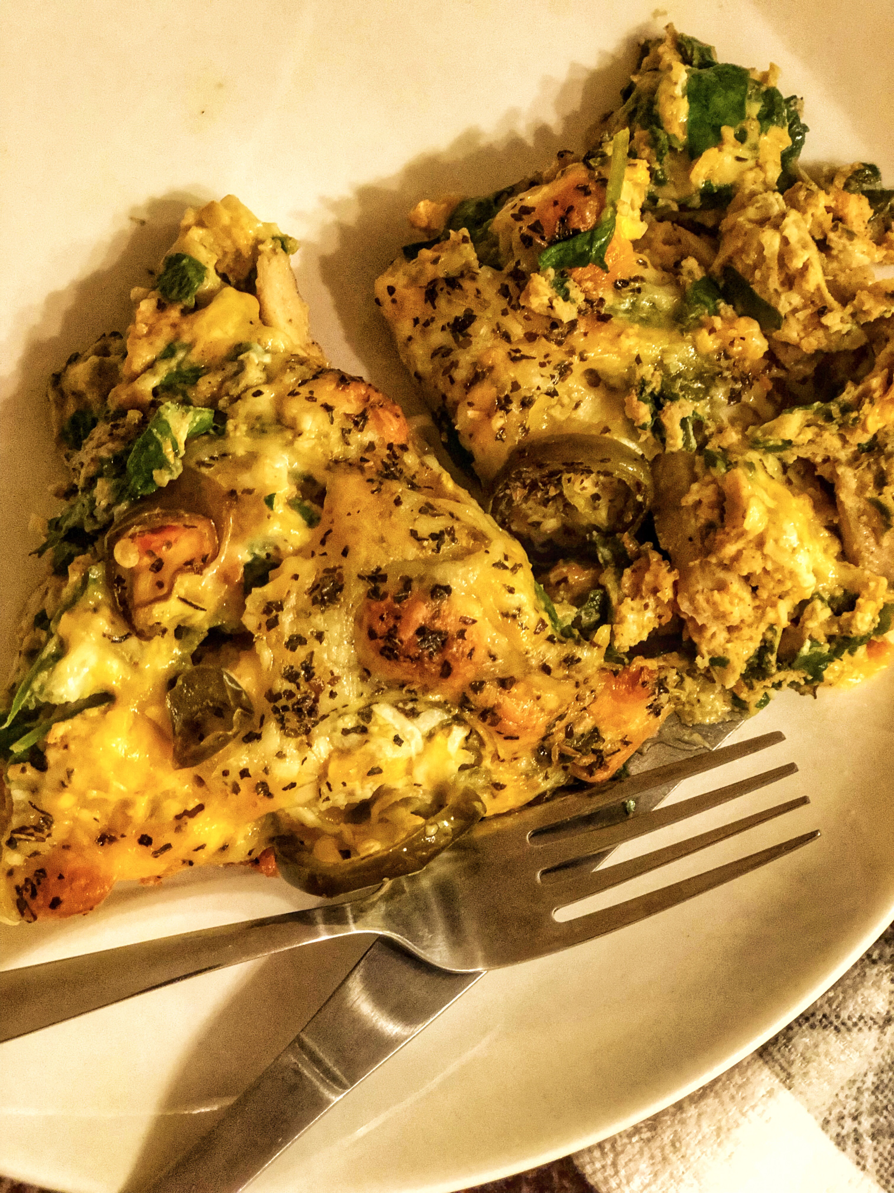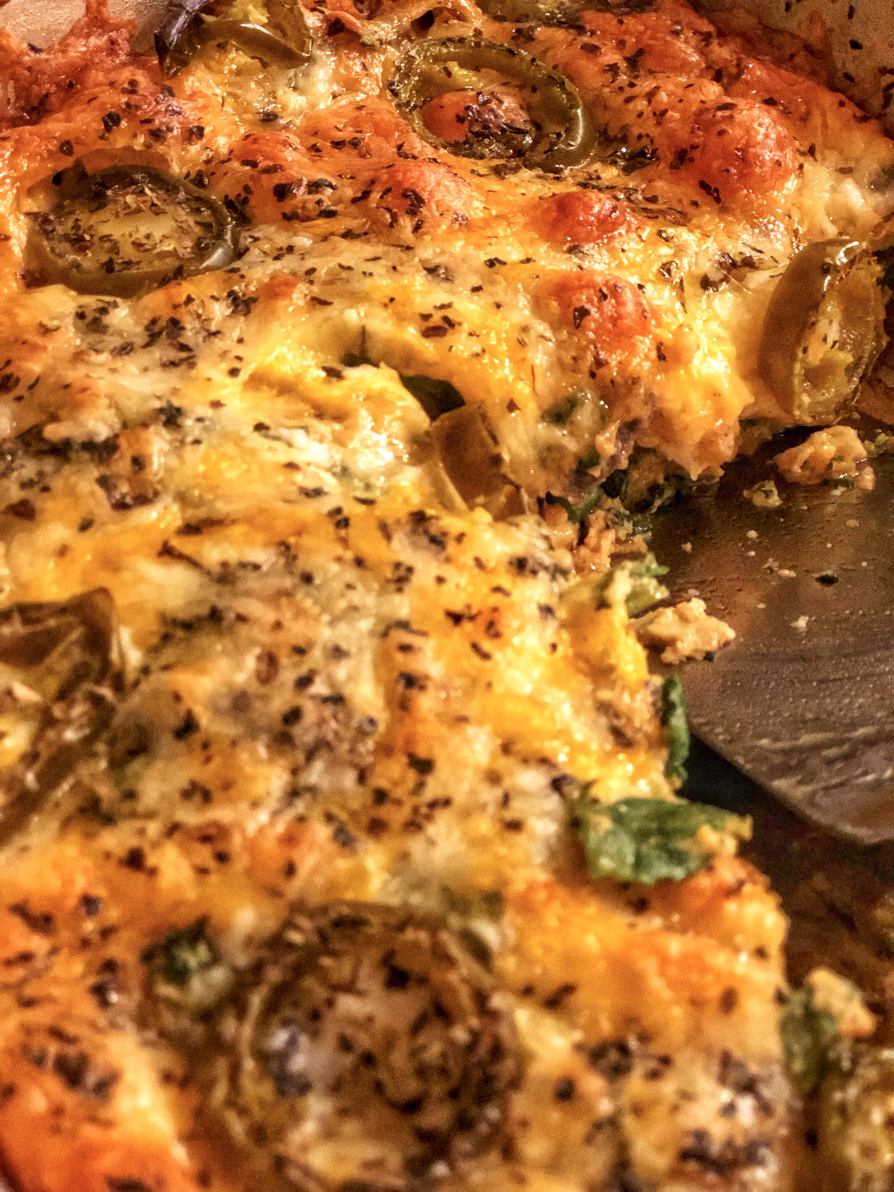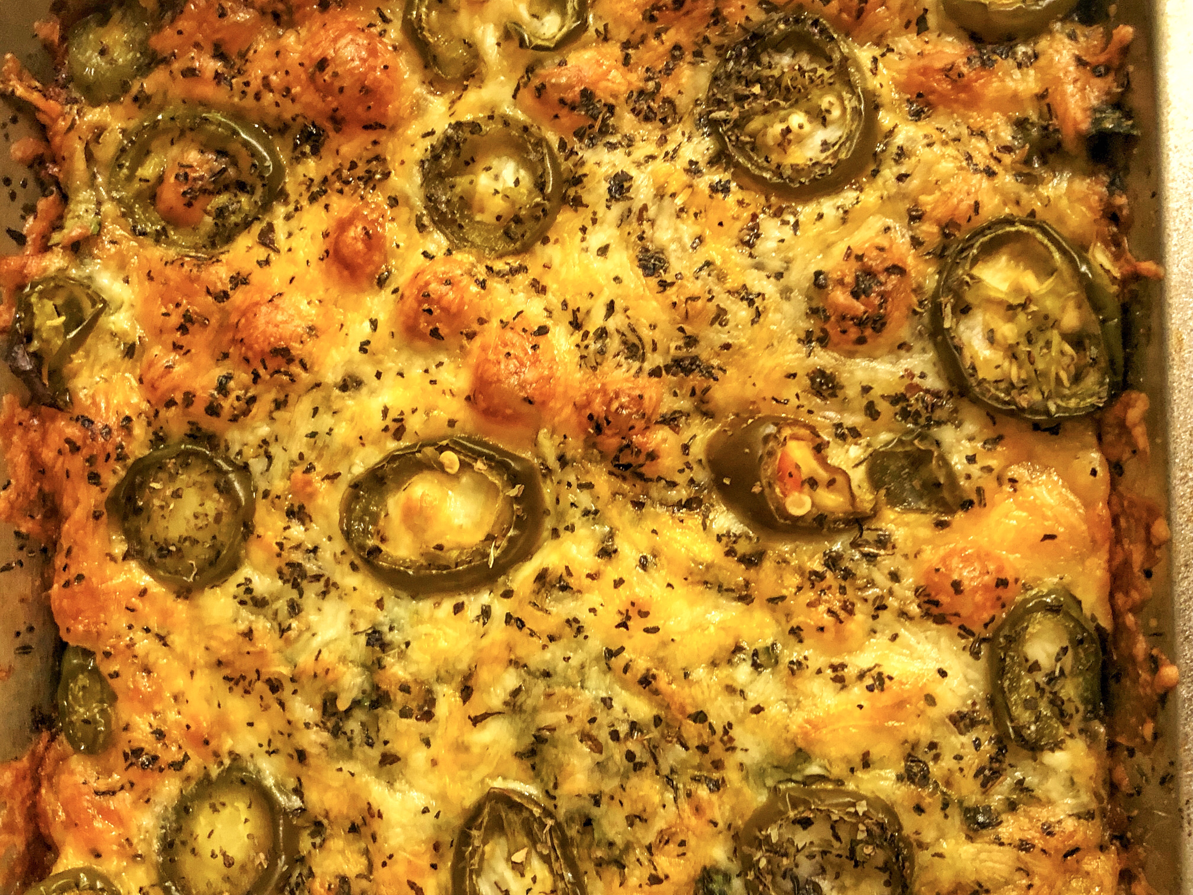 3. Grease a baking pan or pie pan with olive oil or butter and add the mixture to it. Then add 1 egg to the same bowl along with 2 tbsp of heavy cream and beat well. Add that to the mixture and fill the top with grated cheese (1/2 cup) and then top with with jalapeño’s and dried basil herb.