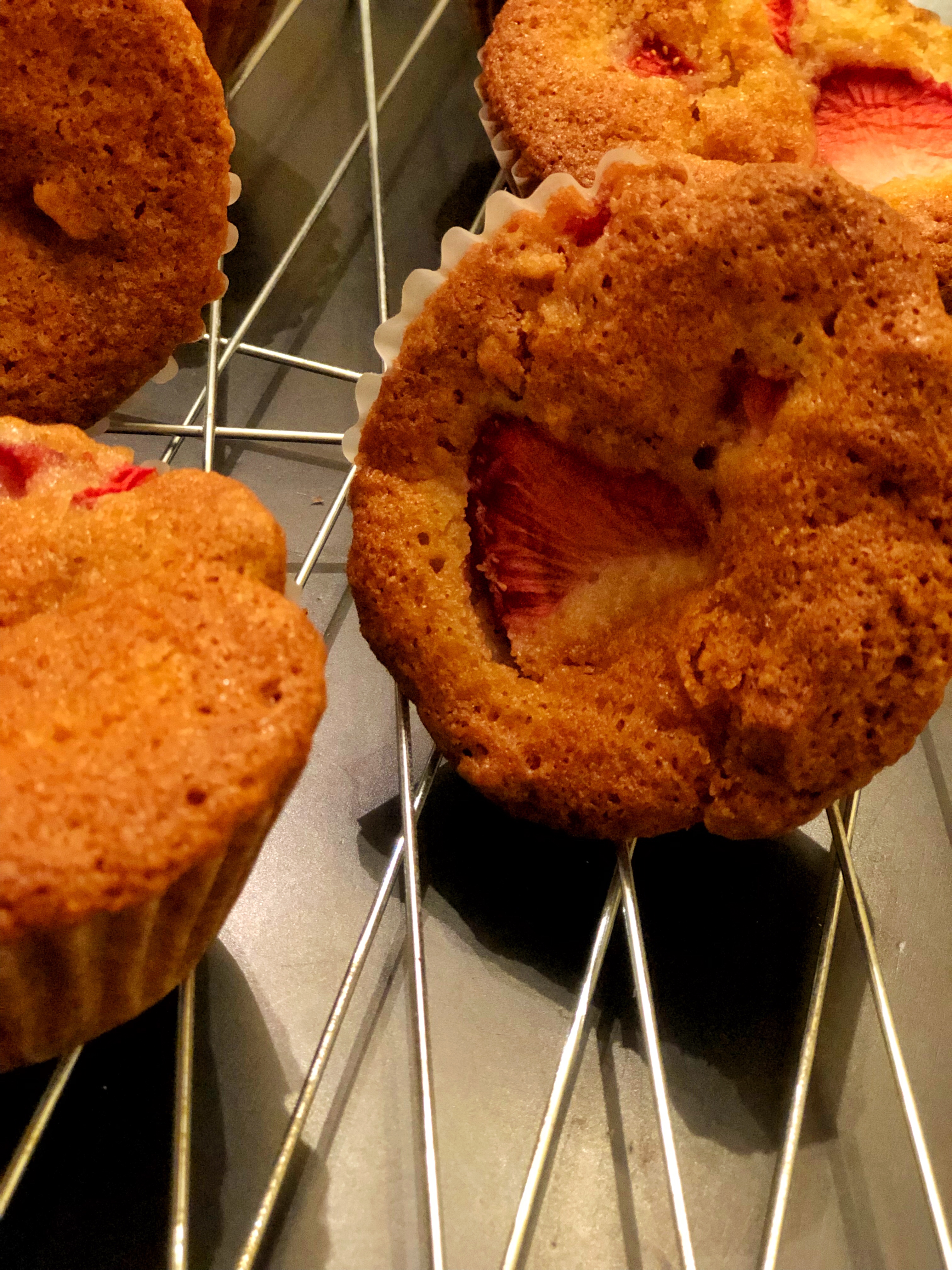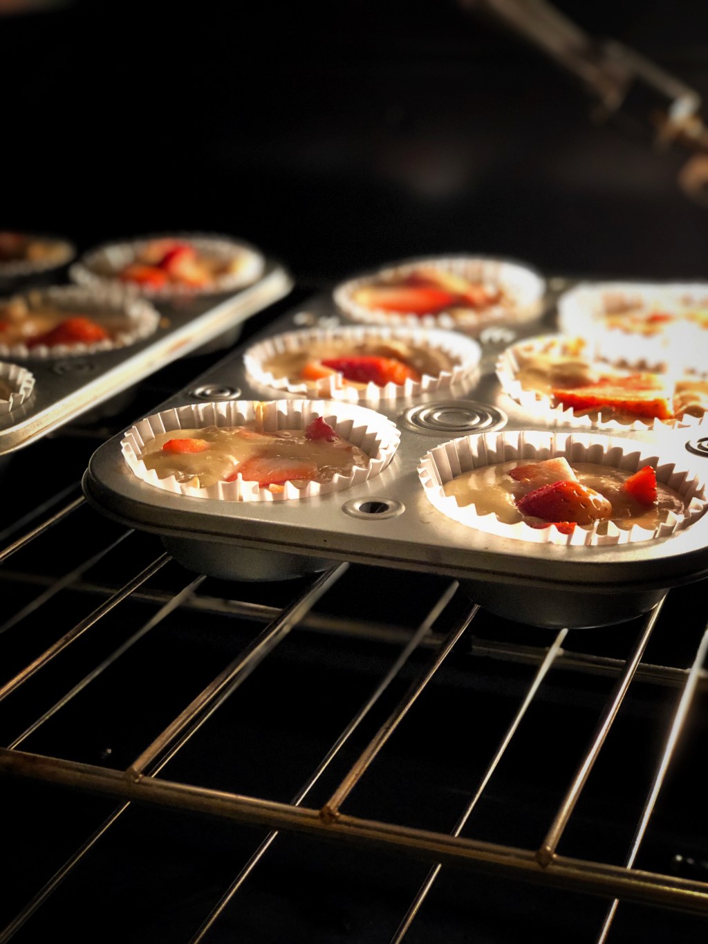 7. Add the muffin cups to the tray and add the batter to it , sliced strawberries on top and bake for 25 mins .