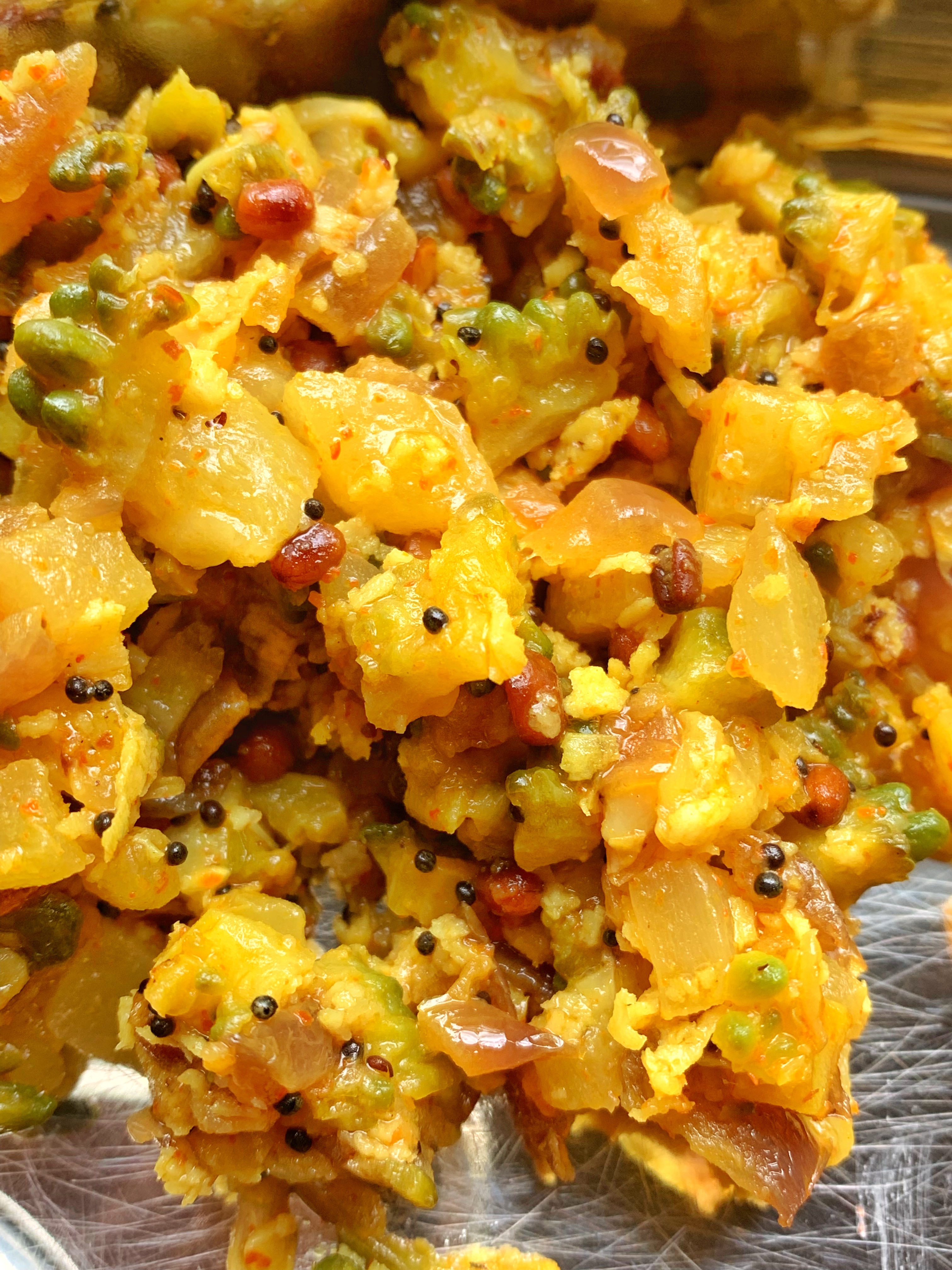 3. Once you notice onions cooked add the boiled veggies and to it add the asafetida powder and red chili powder and toss well together.