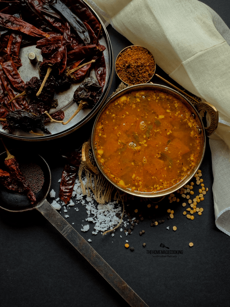 - Heat a pan and then add the “Grinding” items. Start with adding ghee, then add red chilies, dal, coriander seeds.Fry until golden color and then lower the flame or turn off the flame.