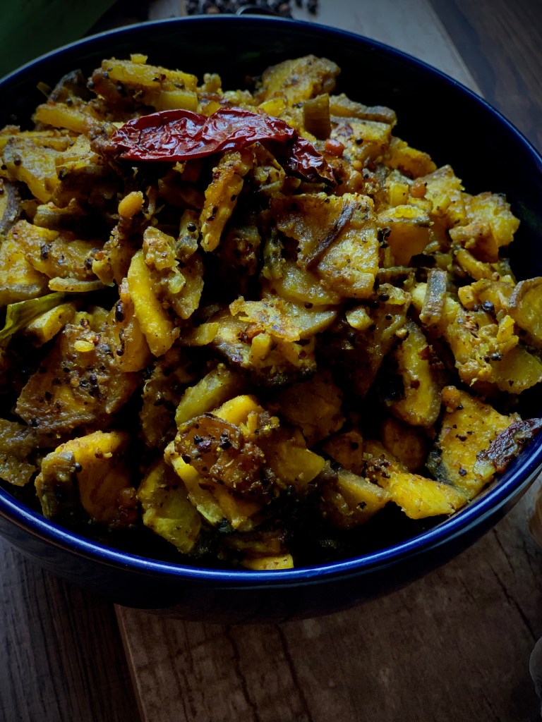 3.In a pan add oil, add the tempering items like mustard, chili, urad dal, and curry leaves. Once the dal turns golden in color add the strained plantains. ( Don’t forget to strain the plantains from water)