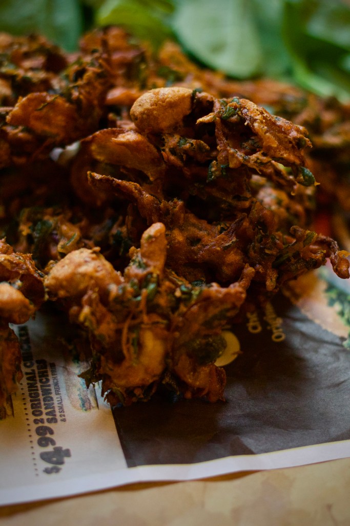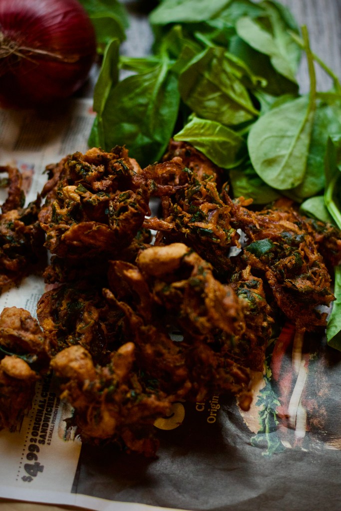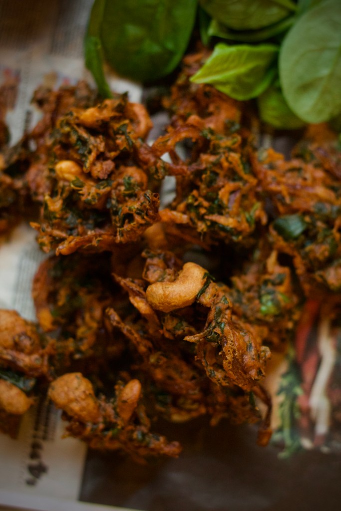 There is always a saying, rain comes, it’s definitely a call for Bhajji’s and Pakora’s. The weather was so pleasing today and was gloomy and drizzling and I was wondering what to make with my freshly bought spinach (greens). I had a look at a famous blogger’s video post, which i was literally craving and she had posted Cashew Pakora. And, i was totally tempted to try, but then wasn’t in a mood to make it with the cashews on the whole, so i added onions and spinach to it to make it a little more kids friendly to stuff greens for them. ;-p