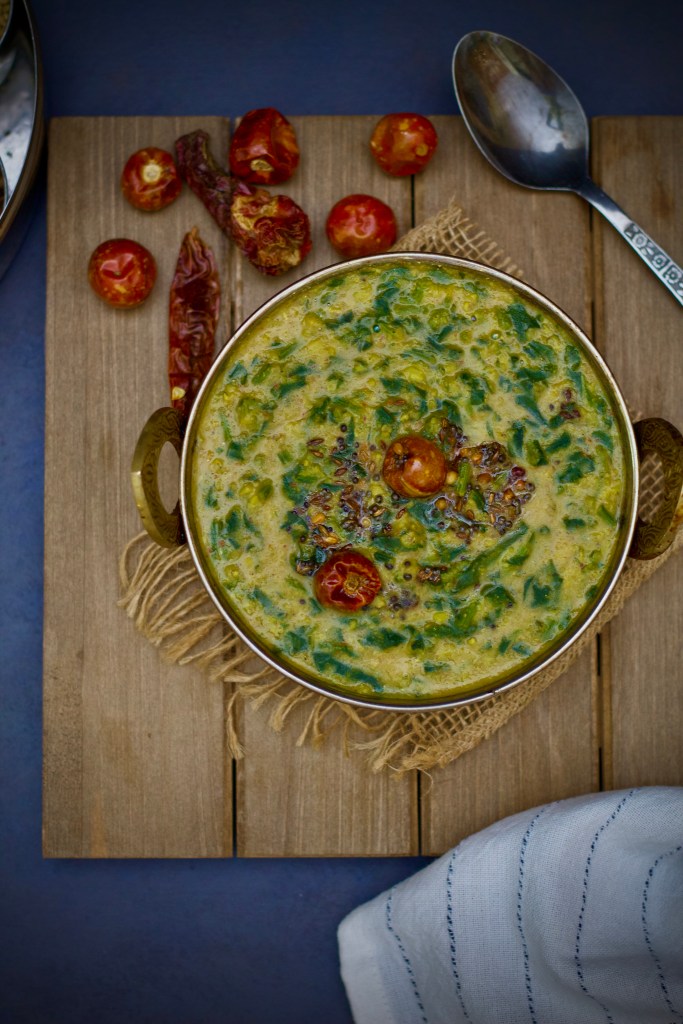 This is quite a unique version of making the Molagootal than the usual “Keerai kootu”, as the usual version will have Moong lentils. This one has Thuvar dal (Pigeon Pea) also instead of just grinding coconuts, red chilies and cumin, we make it with a twist by frying few items and grinding them to a paste.